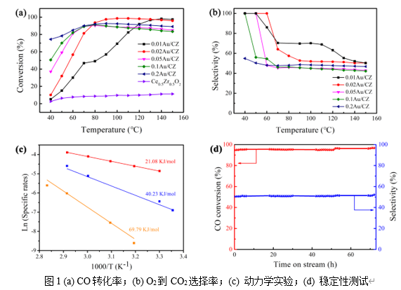 刘志刚老师课题组采用简单经济的共沉淀法以及沉积沉淀法制备了一系列高效金催化剂,当金负载量大于0.05 wt%时,催化剂表面有金团簇出现,当金负载量小于或等于0.05 wt%时,金物种以单原子形式存在。结合表征结果及催化性能,他们发现,零价金在高温下容易引起H2的氧化,所以当金负载量大于0.05 wt%时,虽然催化剂低温活性良好,但是高温下因为H2的竞争反应而无法完全转化CO;以氧化态形式存在的高度分散的金单原子则会抑制H2的氧化,O2更容易与CO发生反应,因此在合适的温度范围内,混合气中的CO几乎可以被完全转化(图1)。有趣的是,即使金都以单原子形式存在,其催化活性也有不同,这可能是因为增加金的负载量即金单原子的分布密度,会引起相邻两个金单原子之间的协同作用,从而在一定程度上影响了反应能垒和路径。