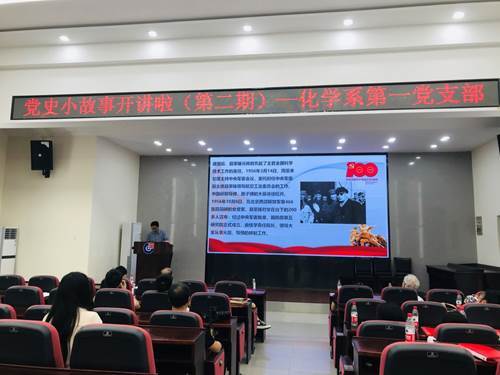 6月8日下午,化学系第一党支部在新化工楼D区报告厅开展迎接建党100周年党史知识学习教育活动--“党史小故事开讲啦”,会议由支部委员杨鹏老师主持。