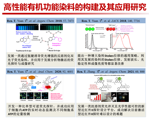 我的研究方向是高性能有机功能染料的构建及其生物成像应用研究。荧光成像作为一种直观、原位的可视化观测技术,其在功能分子标记和检测方面已经得到了广泛的应用。其中,基于有机染料的分子荧光探针具有操作简便、重现性好等优点,因此可被方便地用于生物分子的原位成像、实时无损检测以及生物分子生理变化过程的示踪。然而目前大多数传统有机荧光染料具有发射波长短、Stokes位移小、耐光漂白能力差以及在含水生物环境中荧光猝灭等缺点,造成生物成像应用时信背比偏低和严重的荧光自猝灭现象,限制了其在生物体内的进一步应用。针对这些问题,我们通过分子工程手段和理论设计相结合,开发了一系列新型的高性能有机功能染料,为目前荧光染料在构建荧光成像探针中出现的部分瓶颈问题提供了新的解决方案。