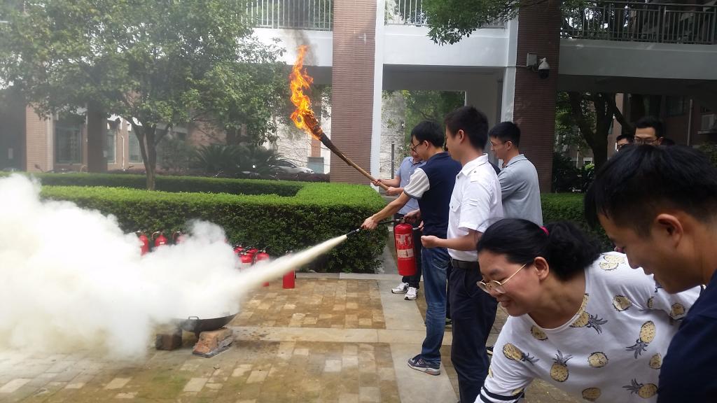 首先,许老师从安全培训的目——即为自身和他人提供一个良好的安全工作环境开始,向大家强调了实验室安全教育的重要性。接着,许老师结合自身多年在实验室安全管理方面的经验,向大家推荐了与实验室安全技术相关的一些书籍和文献资料,并从“RAMP”和“MSDS”这两个方面展开了讲座的主要内容。其中,“RAMP”分别代表四个短语:Recognize hazards、Assess risks、Manage safety、Plan for emergencies and protect the environment,即意识危险、评估风险、控制安全、做好应对紧急情况的准备和保护环境。“MSDS”即试剂安全数据表,即在做实验之前同学们都应先查阅试验中危险试剂的MSDS号。此外,许老师还总结了实验室的五种常见安全事故类型,并介绍了相应的预防措施。最后老师对实验室常见废弃物的处理进行了讲解。讲座结束后,消防员向同学们展示了灭火器使用步骤。紧接着,同学们分组在化工院前庭空地处进行了消防演练,亲自上阵使用灭火器进行了灭火。