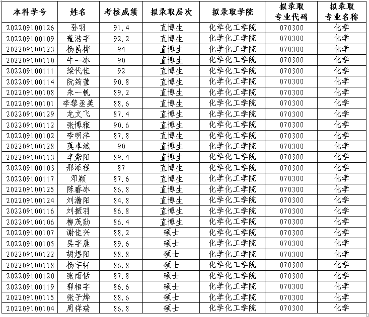 根据教育部及学校关于“强基计划”学生转段研究生相关规定,经学生申请、学院考核,现将JAVSB 接收2022级“强基计划”学生本研转段考核结果予以公示,公示期为2025年9月24日-9月27日。如对拟录取名单有异议,请于公示期内向化学化工学院书面反映。