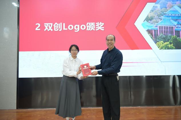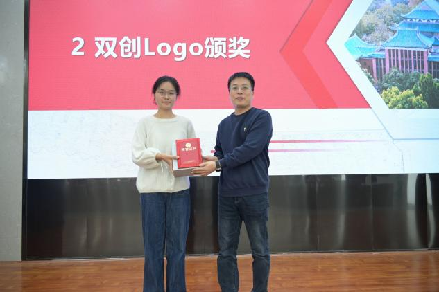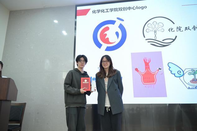 致辞结束后,活动进入双创logo颁奖环节。其中,一等奖作品由张欣粤同学设计,该logo以双C蓝色环形构成镂空烧瓶,瓶中浪花抽象为“E”字与“创”字,既融合化学实验仪器特质,又体现“循环融合、迭代创新”的学科理念,赢得全场好评。随后的颁奖环节中,刘展鹏(三等奖,蒋晓洁老师颁奖)、刘艺文(二等奖,王少飞主任颁奖)、张欣粤(一等奖,李永军院长颁奖)依次登台领奖,现场掌声不断。接着,张欣粤同学分享了她的创作思路,让在场师生对“学科与创新的结合”的理念有了更直观的理解。